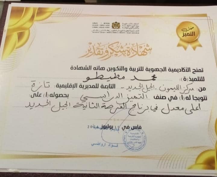 التلميذ محمد مطيطو من مدرسة الفرصة الثانية بتازة يتوج بشهادة التميز للمرة الثانية على صعيد جهة فاس مكناس